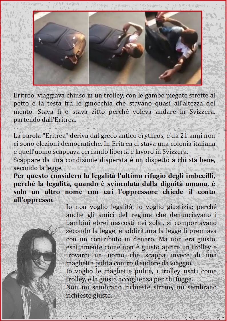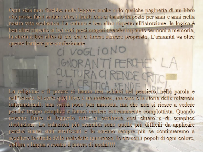 Non sarà l'elemosina "dei potenti e delle religioni" la salvezza dell'umanità, ma il diritto ad una vita dignitosa, ovunque si nasca, ovunque uno vada, ovunque, nel Mondo, ci sarebbe da vivere liberi e felici se l'umanità mandasse al governo esseri umani!