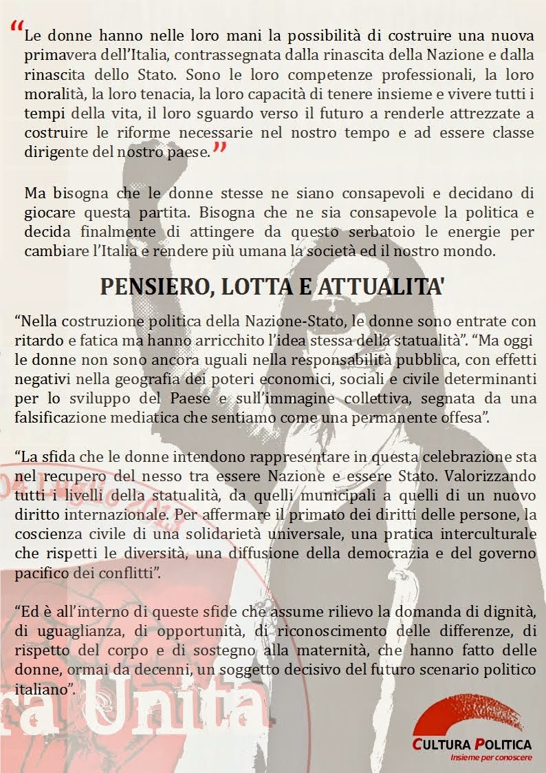 Noi riteniamo che tutte queste leggi siano state anche il risultato della lotta nella Resistenza, perché già allora noi lottavamo per la libertà e la democrazia del nostro Paese, ma rivendicavamo sin da allora, per le donne, un avvenire diverso, una posizione uguale agli uomini, nella famiglia, nella società e in tutte le leggi. Seguì poi l’approvazione di altre leggi, che cito soltanto: sulle pari opportunità; le pensioni alle casalinghe; il divorzio; la tutela della maternità; l’interruzione volontaria della gravidanza, la legge 194 . Concludo il mio intervento dicendo che sappiamo, che in questo momento, sono in atto tentativi revisionisti per cancellare il passato, per rinnegare gli ideali della guerra di Liberazione e della Costituzione, pietre miliari su cui invece si dovrebbe marciare speditamente verso il futuro. Marzo 2008